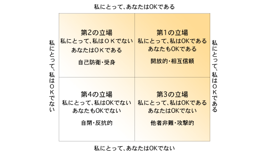 - 私もOK、あなたもOK。この構えを取る人は、幼少期に親からの愛情の篭った、暖かいストロークを十分に与えられてきた人である、この構えを取る人は、自分と他者、そして自分の人生に対して肯定的に受け取ることができる。