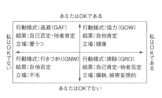 - 私もあなたもOKではない。この構えを取る人は、幼児期に親からの愛情を全く受けなかった人である。この人は、人生に常に絶望を感じ、生きるに値しないと思う感情を抱く。