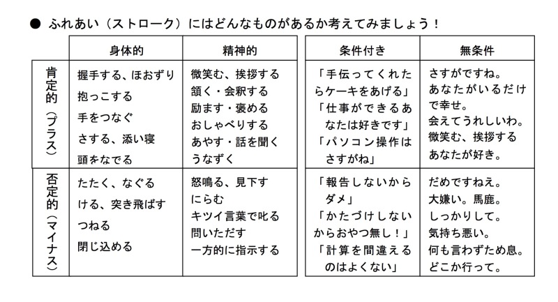 また、相手の行動に対するストロークは「条件つきストローク」であり、相手の存在そのものに対するストロークは「無条件のストローク」といいます。